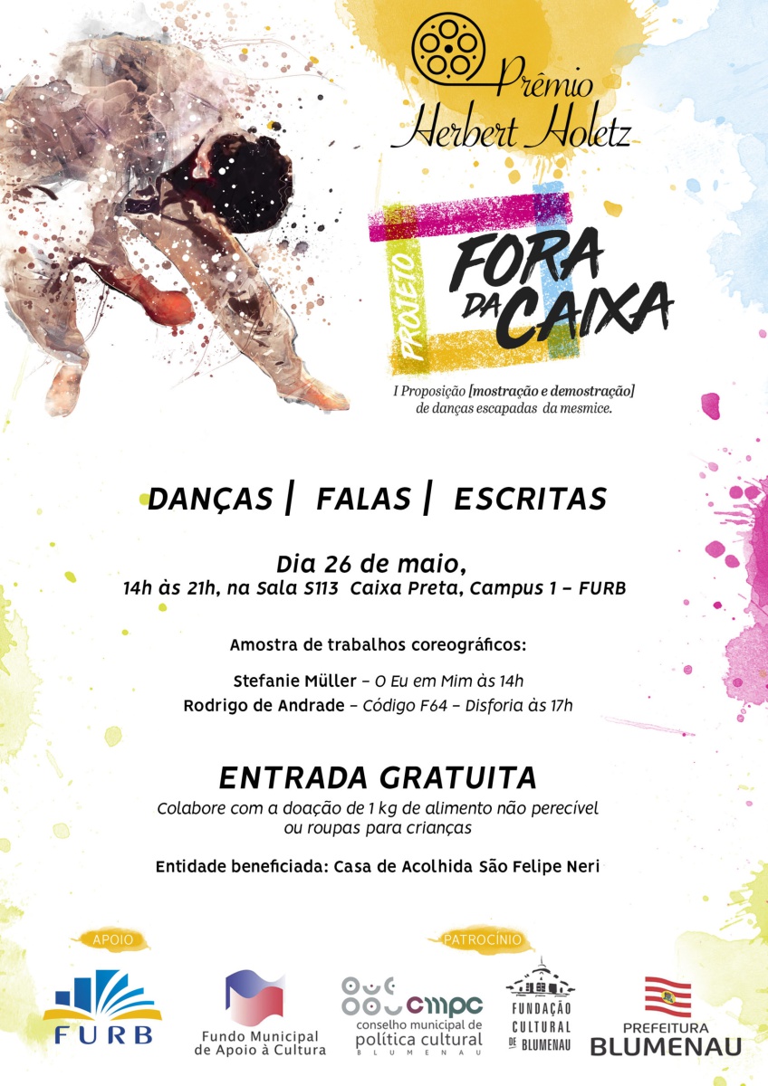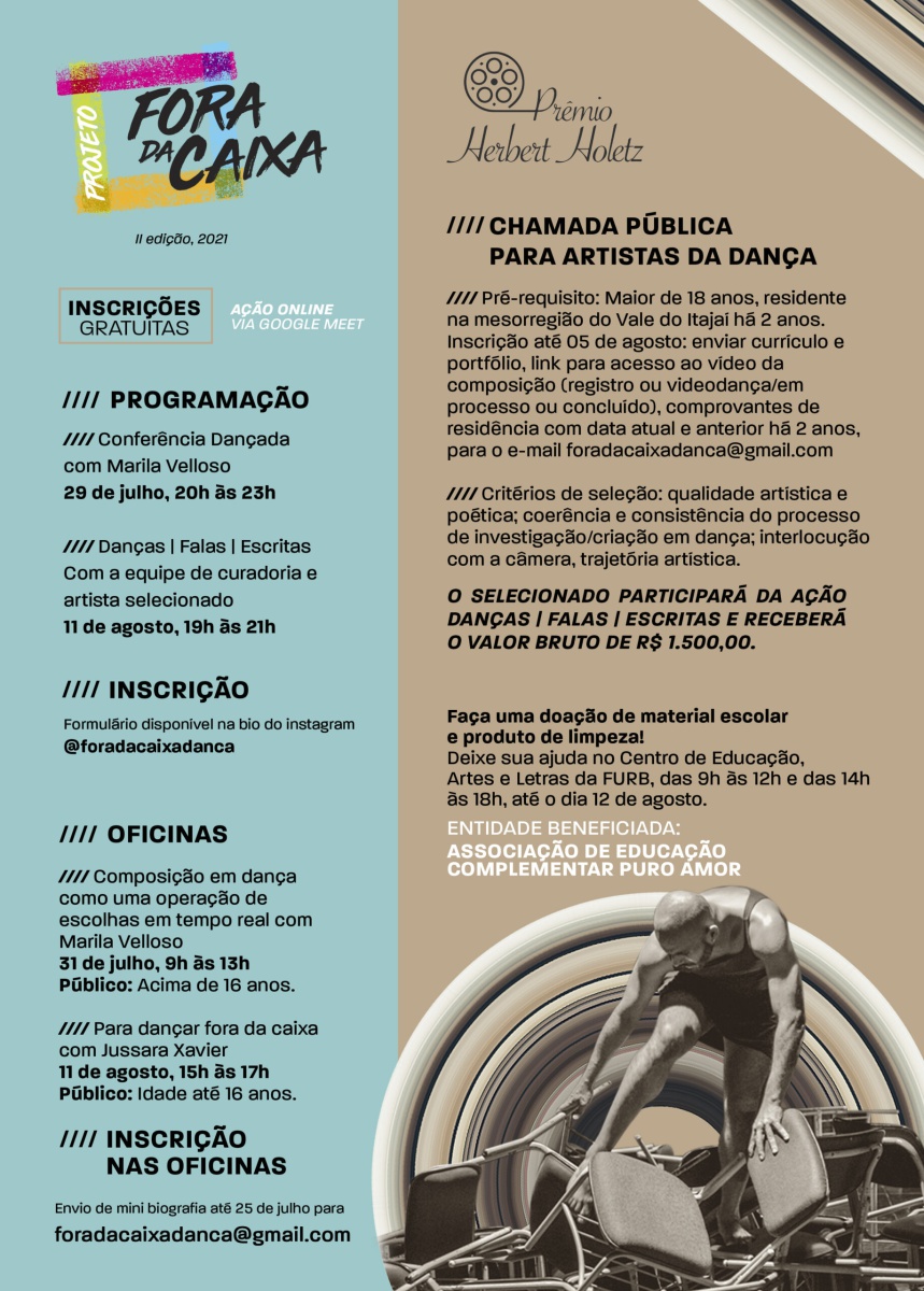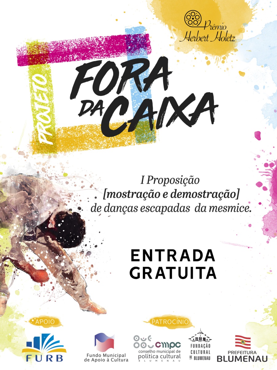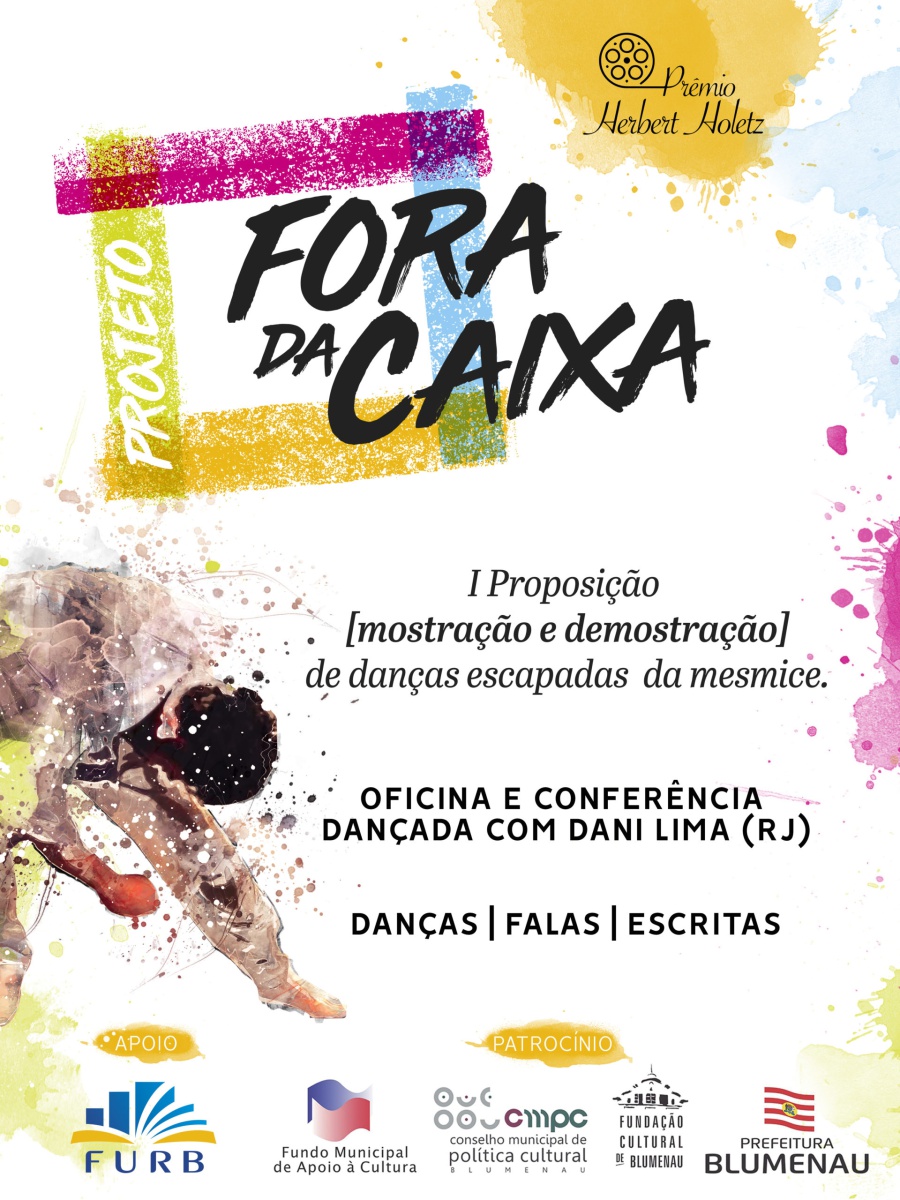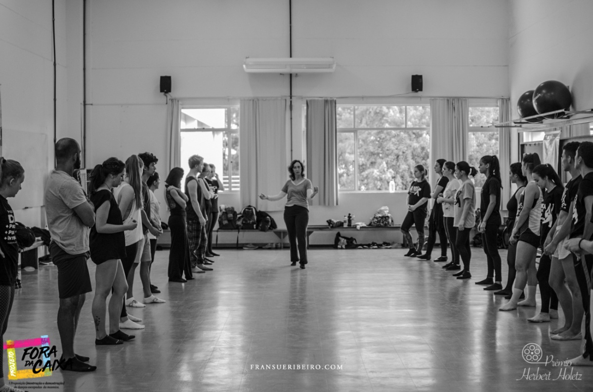 O projeto “Fora da caixa I proposição [mostração e demonstração] de danças escapadas da mesmice” compõe-se de diversas etapas: oficina e conferência dançada com artista convidado; seleção de bolsistas para pesquisa e composição em dança; ação Danças | Falas | Escritas, em que ocorre a mostra dos trabalhos artísticos dos bolsistas, com discussão e processo de desenvolvimento de escritas críticas coordenado pela direção artística do projeto. Como contrapartida social, são oferecidas as oficinas “Para dançar fora da caixa!”, ministradas pelos diretores do projeto, em Centros de Referência de Assistência Social (CRAS) de diferentes cidades catarinenses.