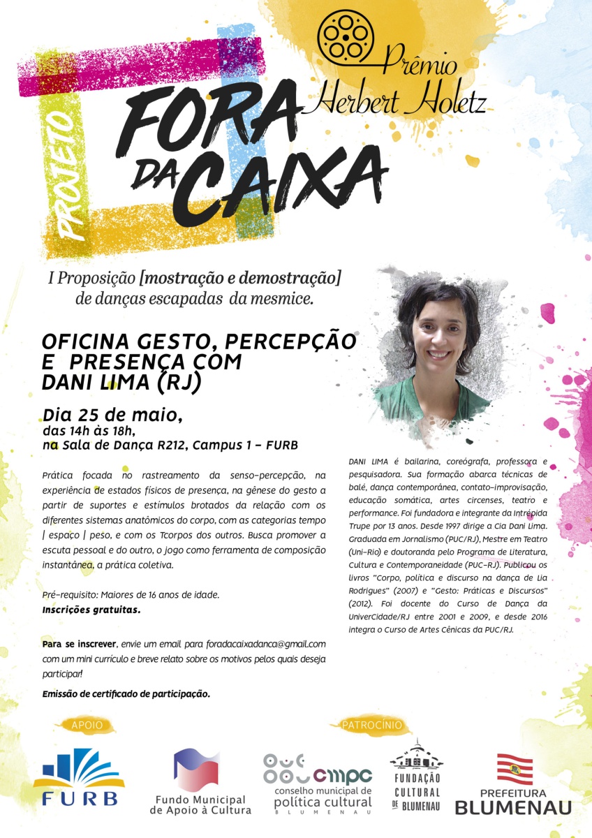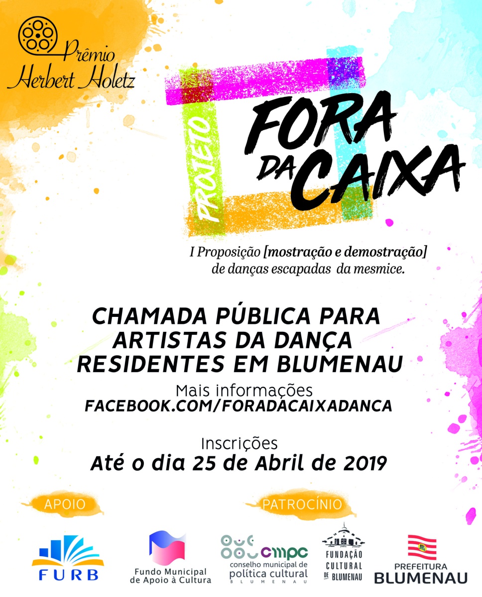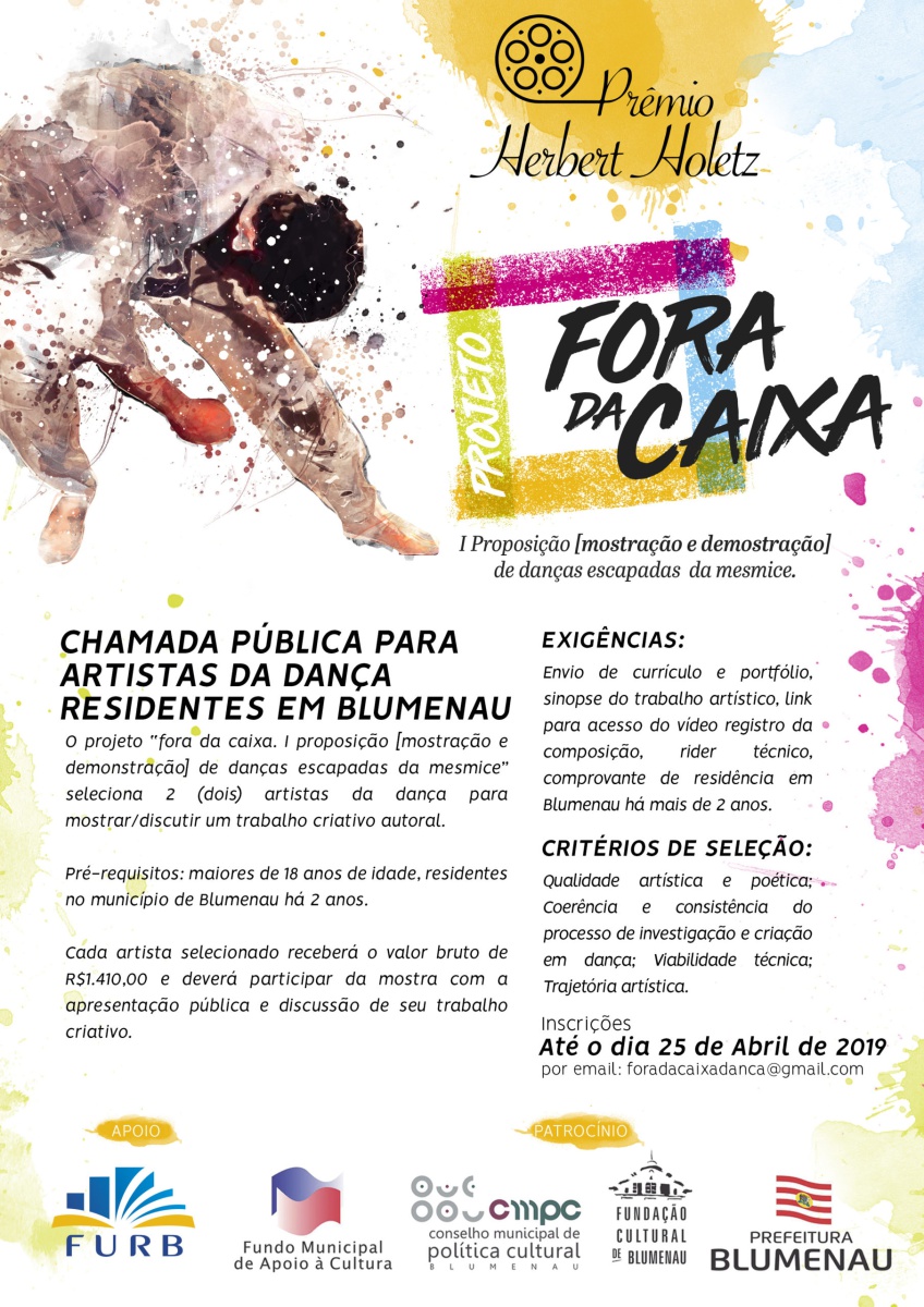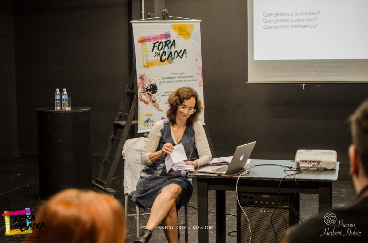 O projeto “Fora da caixa I proposição [mostração e demonstração] de danças escapadas da mesmice” compõe-se de diversas etapas: oficina e conferência dançada com artista convidado; seleção de bolsistas para pesquisa e composição em dança; ação Danças | Falas | Escritas, em que ocorre a mostra dos trabalhos artísticos dos bolsistas, com discussão e processo de desenvolvimento de escritas críticas coordenado pela direção artística do projeto. Como contrapartida social, são oferecidas as oficinas “Para dançar fora da caixa!”, ministradas pelos diretores do projeto, em Centros de Referência de Assistência Social (CRAS) de diferentes cidades catarinenses.