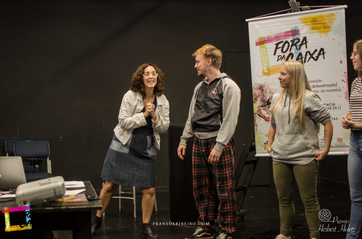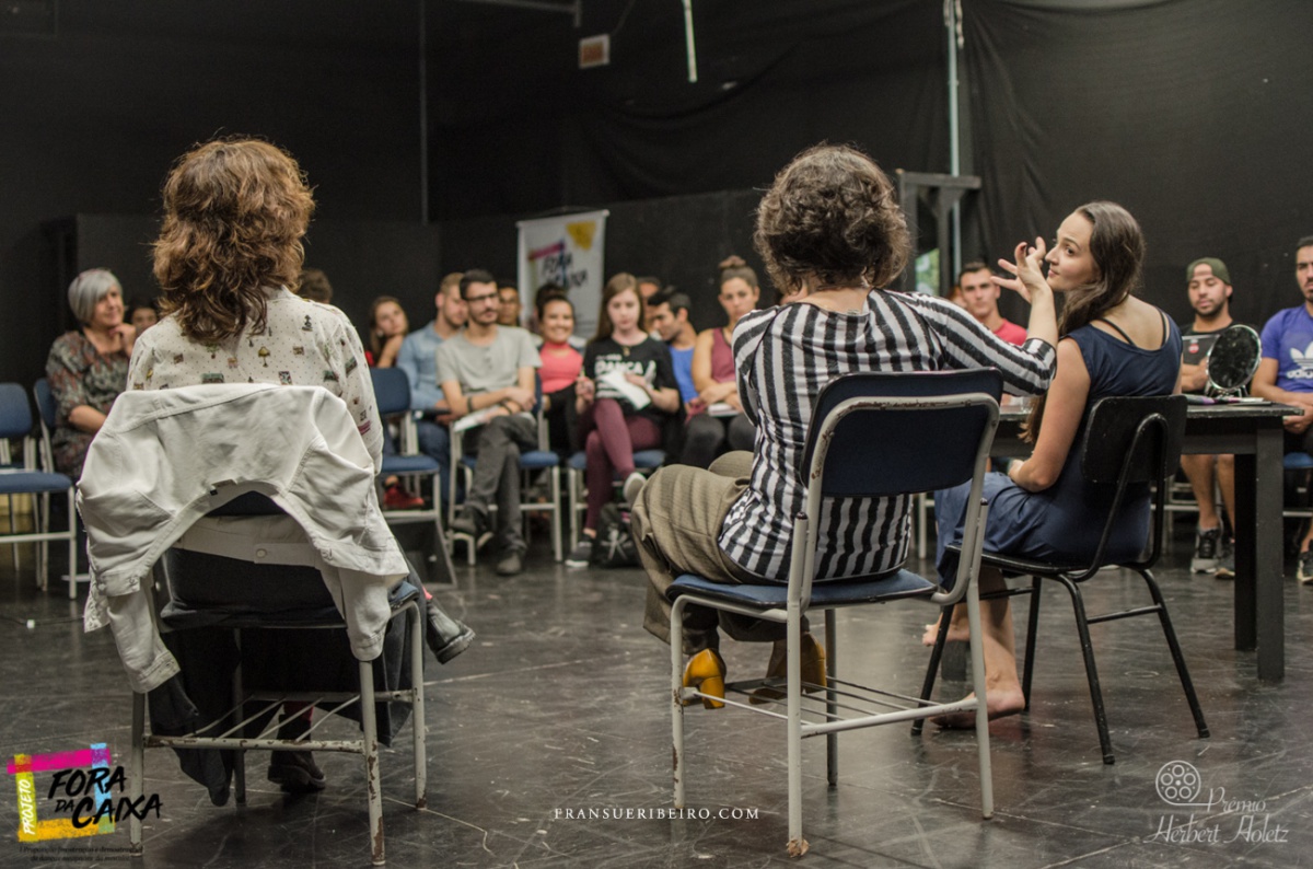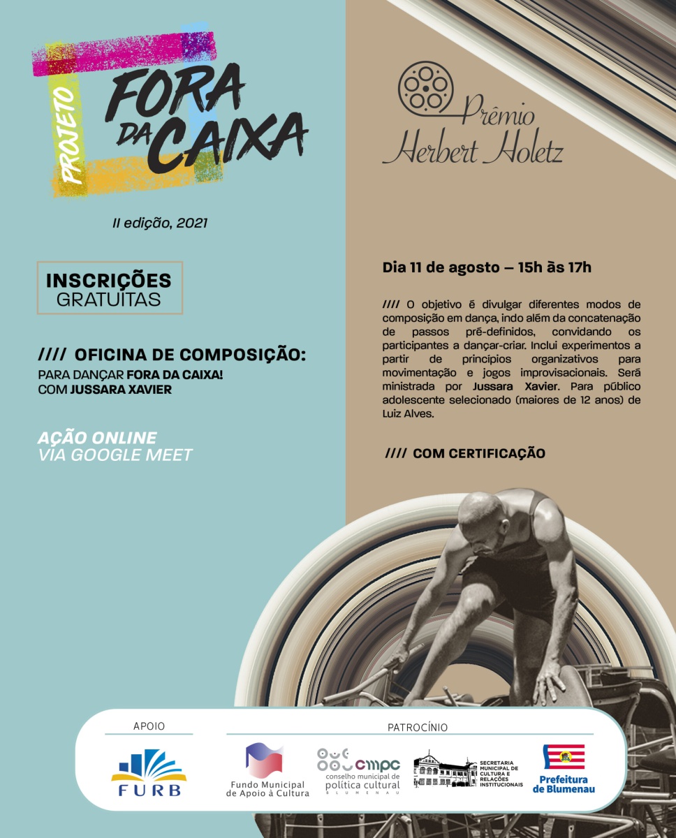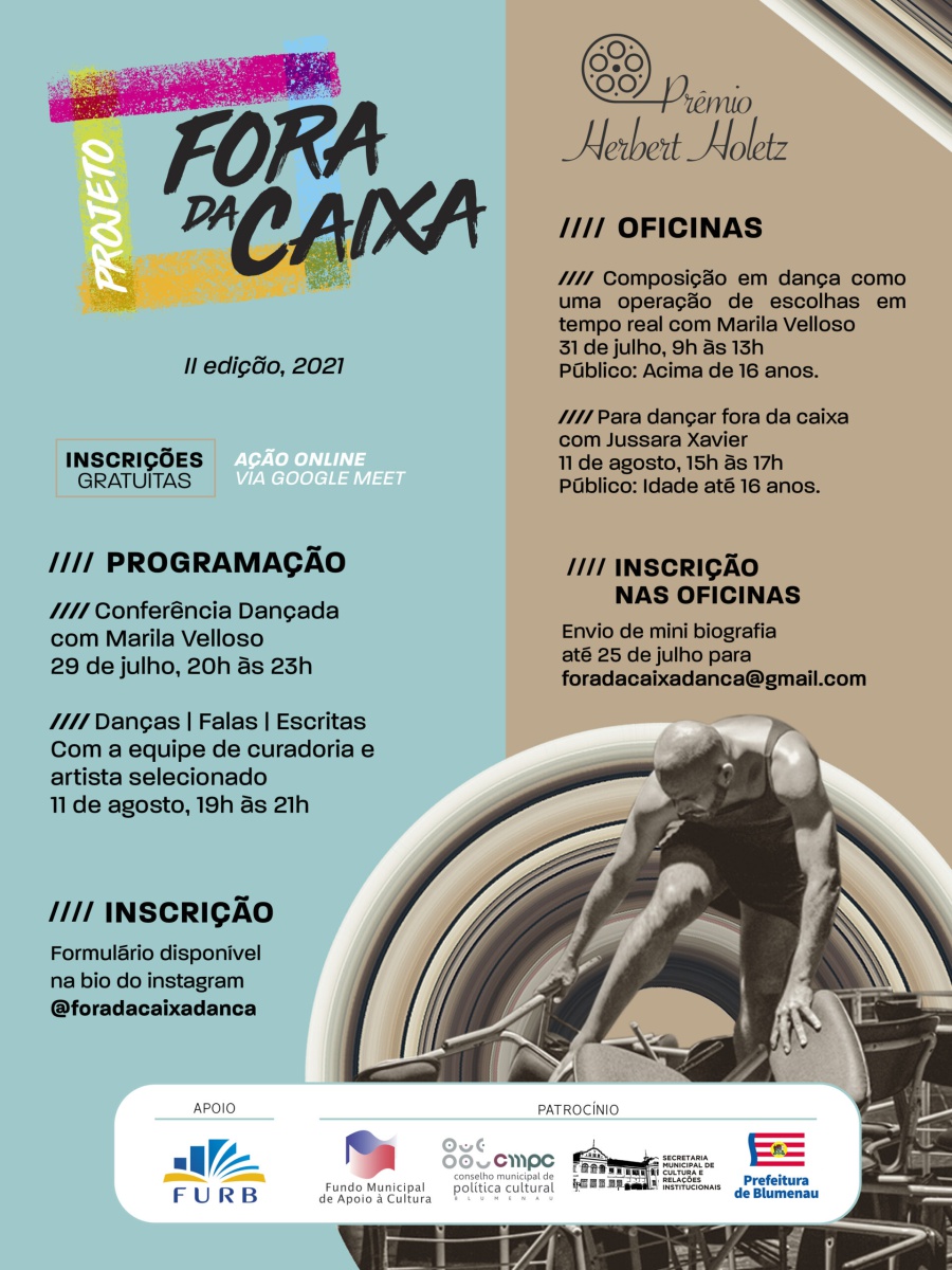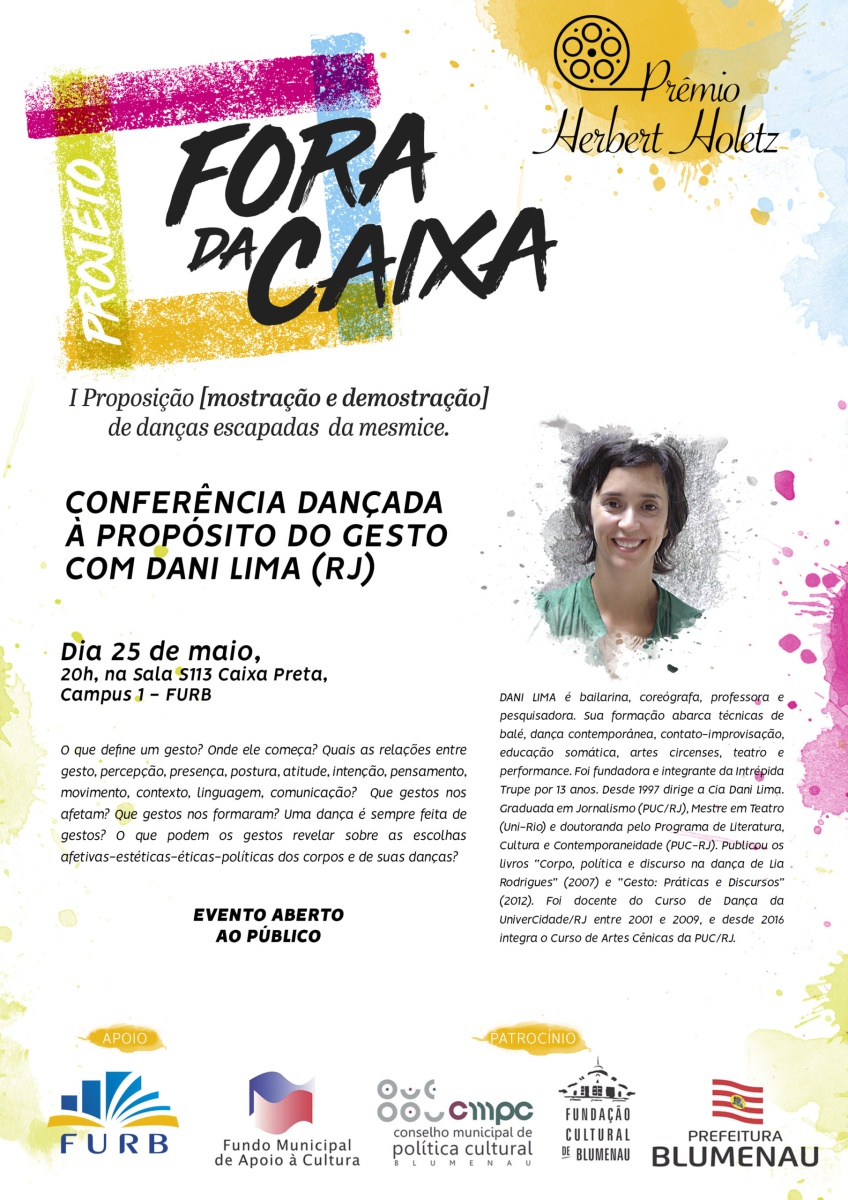 O projeto “Fora da caixa I proposição [mostração e demonstração] de danças escapadas da mesmice” compõe-se de diversas etapas: oficina e conferência dançada com artista convidado; seleção de bolsistas para pesquisa e composição em dança; ação Danças | Falas | Escritas, em que ocorre a mostra dos trabalhos artísticos dos bolsistas, com discussão e processo de desenvolvimento de escritas críticas coordenado pela direção artística do projeto. Como contrapartida social, são oferecidas as oficinas “Para dançar fora da caixa!”, ministradas pelos diretores do projeto, em Centros de Referência de Assistência Social (CRAS) de diferentes cidades catarinenses.