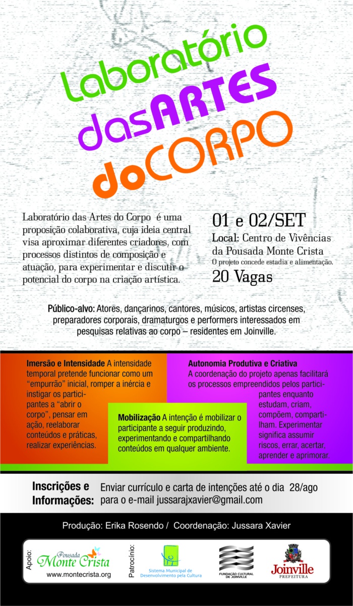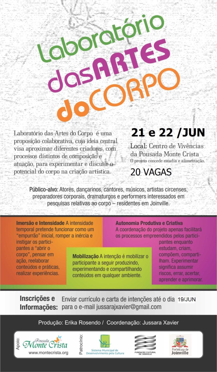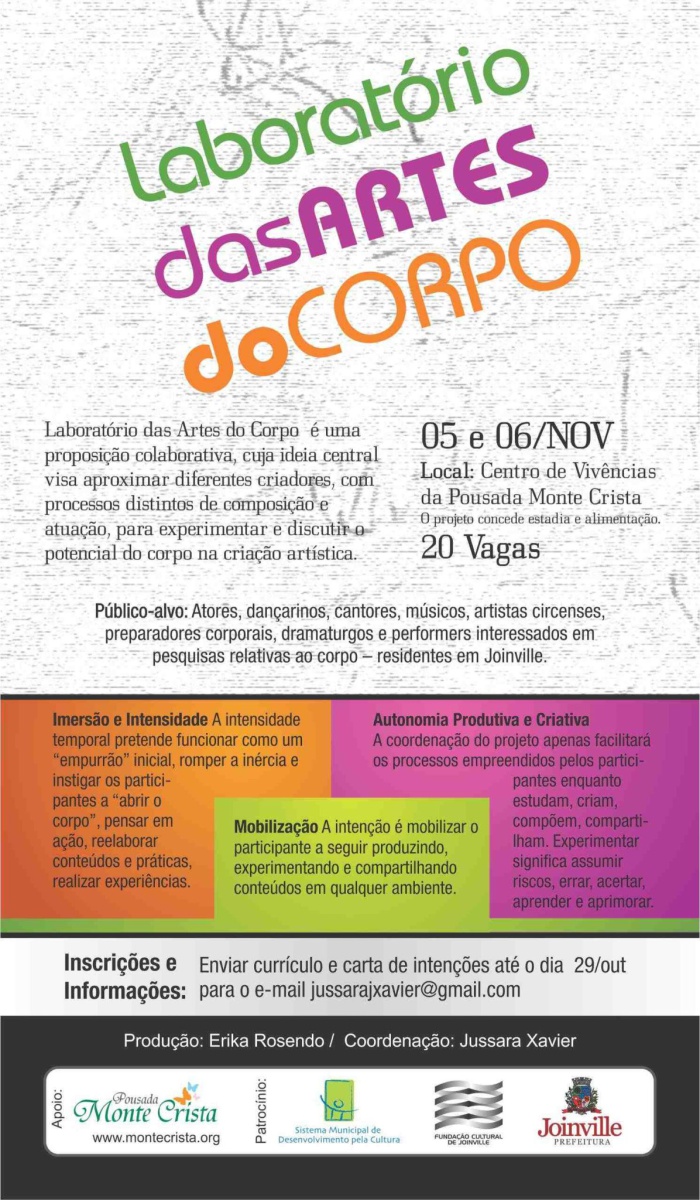 Encontro imersivo com duração de dois dias no Centro de vivências da Pousada Monte Crista, em Garuva (SC). Participação de vinte profissionais entre atores, dançarinos, artistas circenses, preparadores corporais, dramaturgistas, cantores, músicos, performers e interessados, com o objetivo de desenvolver um programa de convivência e investigação artística tomando o corpo como principal elemento de criação. A ideia é a de compartilhamento e troca, portanto, cada participante propõe algo (exercício, texto, imagem, etc.) para discussão/exploração/vivência conjunta. A intenção é a de estabelecer um ambiente educativo favorável à experimentação e troca de saberes.