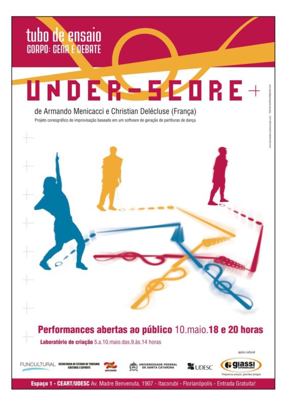 Residência/Espetáculo Under-Score. Com o videasta francês Christian Delécluse e o professor de dança italiano Armando Menicacci. Foram selecionados 12 profissionais catarinenses de diferentes regiões para participar da residência voltada a processos de improvisação e criação em interação com um programa de software e com a projeção de imagens em 4 telas em tempo real. A montagem que resultou da residência foi apresentada ao público no dia 10 de maio na sala Espaço 1 do CEART/UDESC.